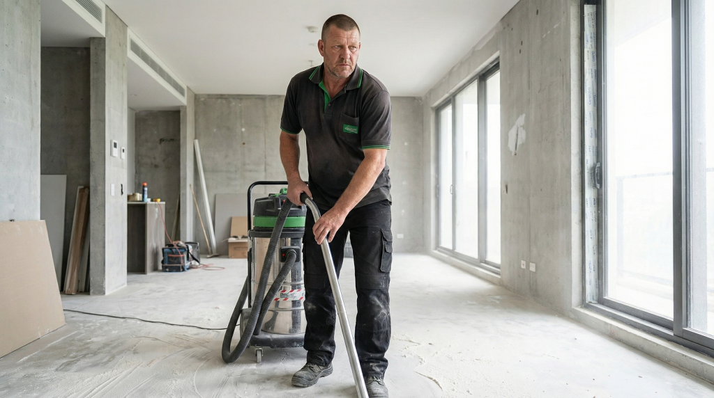 Bei der Baureinigung geht es um „Härtefälle“: Zement, Gips, Silikon und extrem feinen Baustaub. Dafür benötigt man spezielle Chemie und starke Sauger, die ein normaler Haushalt nicht hat.