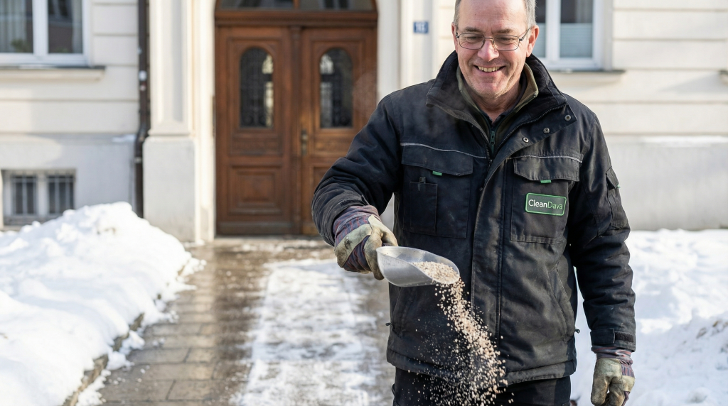 Wir bringen das passende Streumittel mit – natürlich umweltfreundlich und zugelassen für Münchener Gehwege.